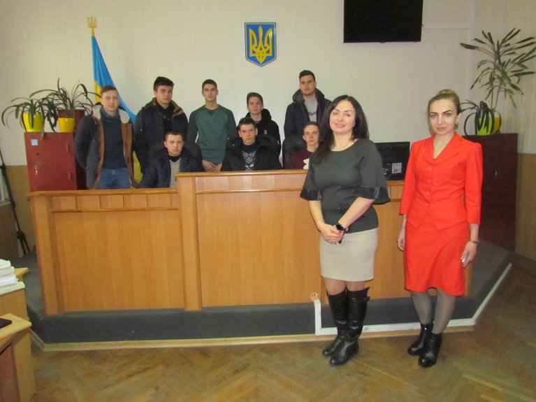Найцікавішим моментом для майбутніх правників в межах організованого заходу стало відвідання чотирьох судових засідань, в яких розглядались адміністративний матеріал відносно неповнолітньої особи та обвинувальні акти у кримінальних провадженнях щодо осіб, які підозрюються у вчиненні кримінальних правопорушень, передбачених ст. ст. 185 (крадіжка), 190 (шахрайство), 289 (незаконне заволодіння транспортним засобом) КК України. Таку можливість для студентів надав суддя Руслан Каленяк до компетенції якого віднесено розгляд кримінальних проваджень. Крім того, Руслан Анатолійович поділився із першокурсниками власним досвідом розгляду резонансних справ, розповів про зміни в чинному законодавстві та те, як вони впливають на роботу судді. Наприкінці розмови суддя закликав студентів ретельно вивчати та неухильно дотримуватися законів, адже в сучасному світі це необхідність для кожної свідомої людини, а для майбутніх служителів Феміди – особливо.